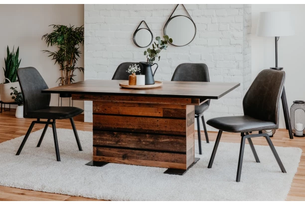 Jídelní stůl o velikosti 160×90 cm je vyroben ve vintage optice dřevěných latí a doplněn černými aplikacemi. Široká středová podnož působí mohutně, poskytuje velmi dobrou stabilitu a dotváří celkově moderní design. V případě potřeby snadno využijete rozkládací funkci, kdy se velikost jídelní plochy rozšíří na 200 cm.