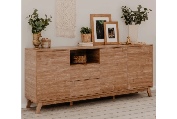 Široká úložná komoda z kolekce Boobang – nábytek v hnědých tónech bambusového dřevodekoru působí díky zajímavé strukturované optice přírodním masivním dojmem. Efekt masivity navíc doplňuje výrazná podnož se dřevěnými nožkami. Nábytek je tak v interieru velmi útulný a zároveň zůstává funkční a praktický.
