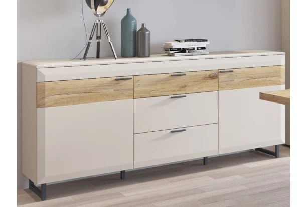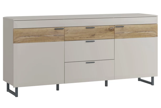 Široká komoda z kolekce Romy – originálně řešený nábytek se zaoblenými hranami zaujme na pohled. Zajímavý design nábytku podtrhuje kombinace šedá/dub flagstaff, která působí moderně a útulně zároveň.