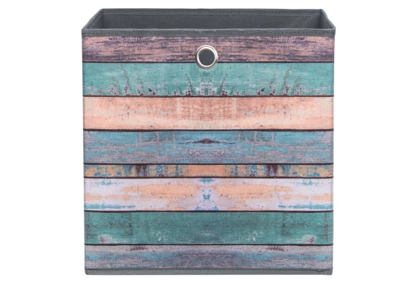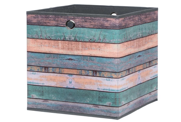 Úložný látkový box s potištěnými motivy barevných dřevěných prken poslouží jako praktická součást regálu anebo vnitřního vybavení skříněk, případně ho můžete umístit samostatně. Jeho konstrukci lze kdykoliv snadno složit a uschovat.
