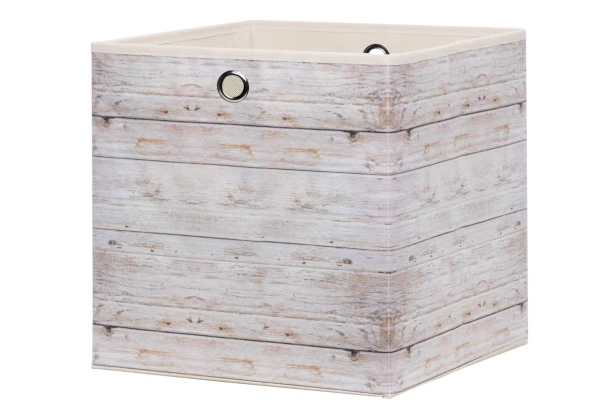 Úložný látkový box s potištěnými motivy světlých dřevěných prken poslouží jako praktická součást regálu anebo vnitřního vybavení skříněk, případně ho můžete umístit samostatně. Jeho konstrukci lze kdykoliv snadno složit a uschovat.