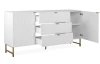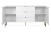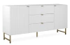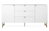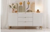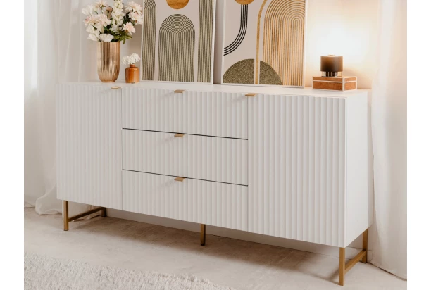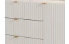 Široká komoda se zásuvkami z řady Edinburgh – stylový nábytek zaujme na pohled bílými strukturovanými povrchy, úchytky a kovovu podnoží v mosazném provedení. Tento nábytek tak vynikne a ozvláštní atmosféru v každém interieru.