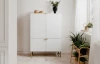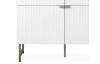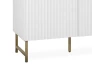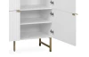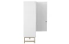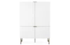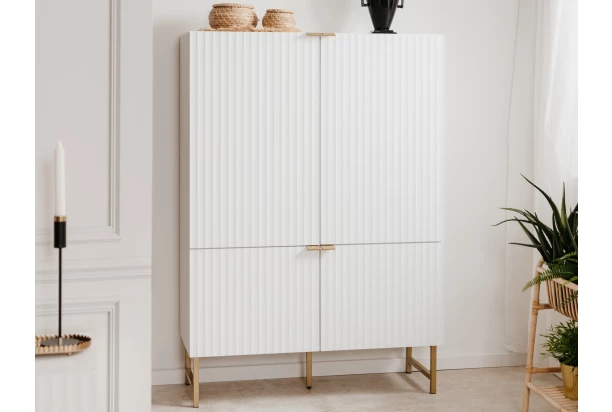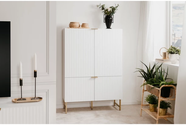Vysoká skříňka z řady Edinburgh – stylový nábytek zaujme na pohled bílými strukturovanými povrchy, úchytky a kovovu podnoží v mosazném provedení. Tento nábytek tak vynikne a ozvláštní atmosféru v každém interieru.