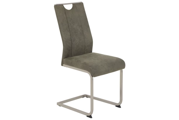 Jídelní židle na stabilní kovové podnoži z broušeného kovu se dokonale hodí do moderní jídelny. Očalouněna stylovou látkou v hnědé vintage optice kůže. Oceníte i praktické kovové madlo, které poslouží pro snazší manipulaci se židlí.