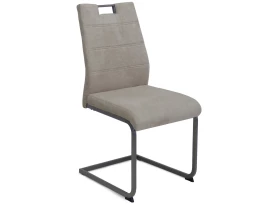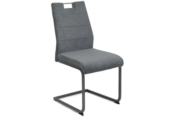 Moderní jídelní židle na tmavě šedé podnoži je doplněna kovovým madlem pro snadnou manipulaci při odsouvání od stolu. Stabilní kovovou podnož doplňuje měkké látkové čalounění v barvě středně šedá.