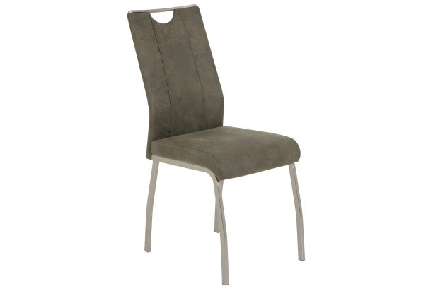 Jídelní židle na stabilních kovových nohách z broušeného kovu se dokonale hodí do moderní jídelny. Očalouněna stylovou látkou v hnědé vintage optice kůže. Oceníte i praktické kovové madlo, které poslouží pro snazší manipulaci se židlí.