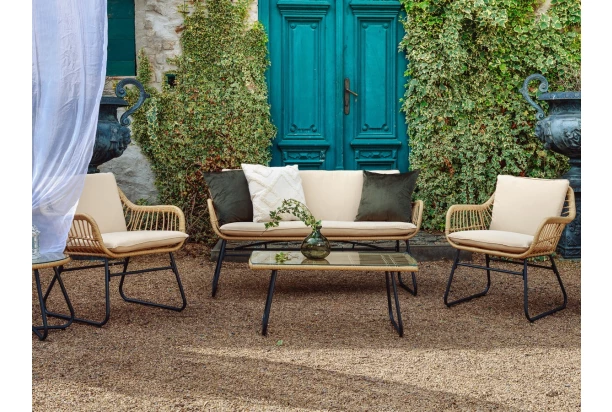 Útulný 4-dílný set zahradního nábytku z kovu a béžové imitace ratanu má elegantní design. Obsahuje obdélný konferenční stolek, pohovku a dvě pohodlná křesla s polštáři. Snadno si tak vytvoříte příjemné komfortní prostředí na zahradě, venkovní terase nebo třeba i balkonu.