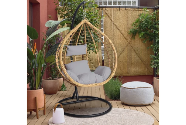 Závěsné křeslo ve světlé hnědé imitaci ratanu je doplněno polštáři pro příjemnou pohodu nejen na zahradě, ale i třeba v interieru. Můžete v něm popíjet odpolední kávu, číst si anebo jen tak v klidu relaxovat. Toto křeslo ve tvaru vajíčka vypadá atraktivně a skvěle tak doplní prostor v zákoutí vaší zahrady i venkovní terasy.