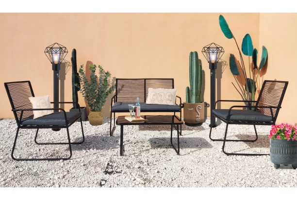Zahradní 4-dílný set nábytku se rozměrově hodí na každou zahradu, terasu i třeba balkon. Černá kovová konstrukce s trendy propletením je doplněna sedacími polštáři pro pohodlné posezení u kávy nebo osvěžujícího drinku. Obsahuje dvoumístnou lavici, dvě křesla a obdélný stolek.