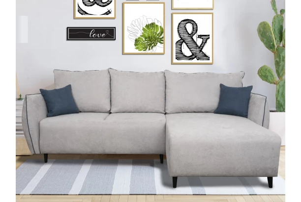 Stylová rohová sedací souprava v polštářové optice nabízí komfortní měkké sezení, které si snadno oblíbíte. Ideálními rozměry pasuje do každého prostoru a navíc umožňuje umístit otoman univerzálně na pravou nebo levou stranu. Světle šedé látkové čalounění doplňuje kontrastně modré lemování a polštářky. Včetně úložného prostoru a rozkládací funkce.