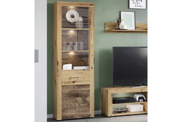 Vysoká vitrína z programu Fly – moderní a zároveň praktický nábytek s optikou širokých rámů působí velmi útulně díky kombinaci dřevodekoru dub artisan a dřevodekoru dub ribbeck.