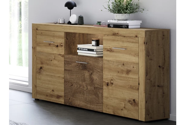 Komoda z programu Fly – moderní a zároveň praktický nábytek s optikou širokých rámů působí velmi útulně díky kombinaci dřevodekoru dub artisan a dřevodekoru dub ribbeck.