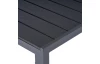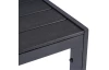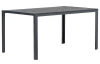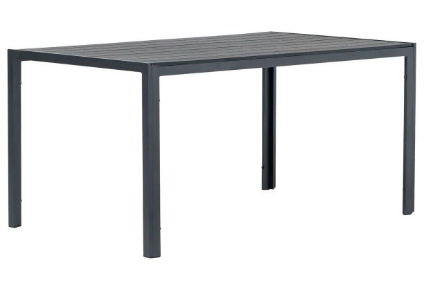 Obdélný zahradní jídelní stůl o rozměru 150×90 cm má stabilní konstrukci z antracitového kovu a horní plochu z odolné imitace černých dřevěných prken. Stůl se tak bude skvěle hodit k tmavým zahradním židlím na moderně zařízené zahradní terase.