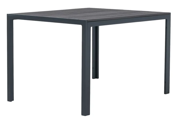 Čtvercový zahradní jídelní stůl o rozměru 90×90 cm má stabilní kovovou konstrukci z antracitového kovu a horní plochu z odolné imitace černých dřevěných prken. Stůl se tak bude skvěle hodit k tmavým zahradním židlím na moderně zařízené zahradní terase.