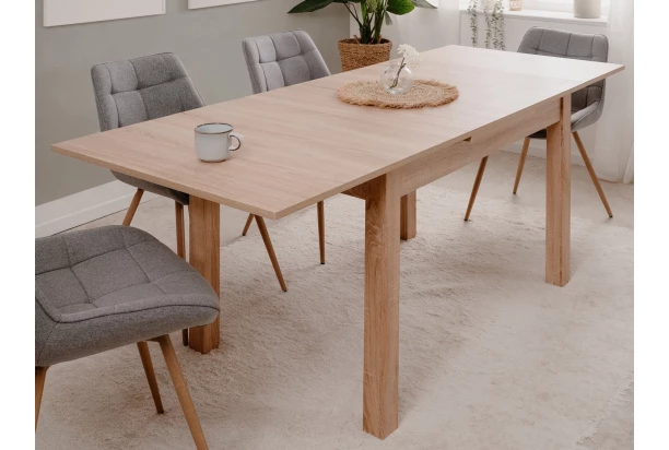 Praktický jídelní stůl o velikosti 120×80 cm můžete snadno rozložit na šířku 200 cm pomocí bočních výsuvných ploch. Tento stůl v dekoru dub sonoma je vyroben v klasickém univerzálním stylu tak, aby pasoval téměř do jakékoliv jídelny či kuchyně.