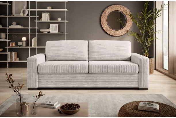 Komfortní pohovka Vanilla je vybavena kvalitním rozkládacím mechanismem s matrací pro trvalé spaní, kde najdou pohodlí dvě osoby. Na útulnosti přidává i měkoučká potahová látka s proužkovanou strukturou v odstínu světle krémová. Pohovka s rozkladem je ideální také do menších bytů, kde může posloužit jako plnohodnotné lůžko. Díky snadnému rozložení se pohovka promění v dvoulůžkovou postel během pár vteřin.