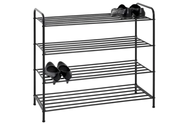 Černý kovový regál na boty se svým univerzálním designem hodí do moderní i klasické předsíně. Regálový botník nabízí 4 police pro odkládání až 16 párů bot.