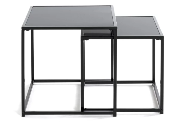 Sada 2 kusů různě velkých stolků z kombinace černého kovu a černého skla se parádně hodí k moderní sedačce. Větší a menší stolek můžete využít společně anebo je rozmíst kamkoliv do prostoru obývacího pokoje, kde prakticky poslouží třeba jako odkládací stolky na lampičku, dekorace nebo kytky. Záleží jen na vás. Menší stolek je možné zasunout pod větší a ušetřit tak prostor.