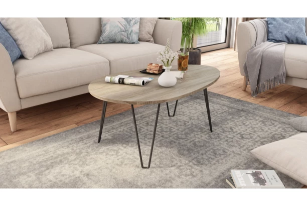 Oválný konferenční stolek o velikosti 98×61 cm je vyroben v dekoru dub sonoma a skvěle doplní stylově zařízený obývák. Černá kovová podnož je stabilní a zároveň působí vzdušně.