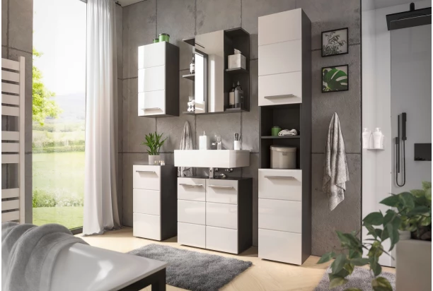 Koupelnová stojací skříňka z programu Gloss je vyrobena v kombinaci antracit/bílá lesk a bude dobře pasovat do moderně zařízené koupelny. Lesklé přední plochy doplňují decentní vodorovné linie a lesklé úchytky.
