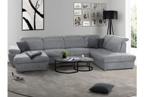 Komfortní sedací souprava Alabama ve tvaru pravé U má kvalitní vypolstrování doplněno opěrkami hlavy, které si můžete polohovat podle vlatní potřeby. Tato prostorná sedačka je očalouněna jemně strukturovanou látkou v odstínu středně šedá. Navíc je doplněna polštářky a praktickou rozkládací funkcí na lůžko pro vaše návštěvy. V levé části je otoman, na kterém můžete spokojeně relaxovat – pod otomanem najdete praktický úložný prostor, kam uschováte třeba věci sezónní potřeby.