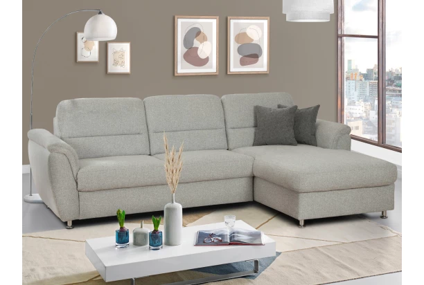 Elegantní rohová sedací souprava s kvalitním polstrováním má vyšší opěradlo pro váš každodenní komfort. Pohodlí doplňují polštářky. Očalouněna jemně strukturovanou tkaninou v barvě světlý šedo-bílý melír. Sedačka s otomanem vytváří pravý roh. Varianta sedačky bez podhlavníku, úložného prostoru a funkce rozkladu.