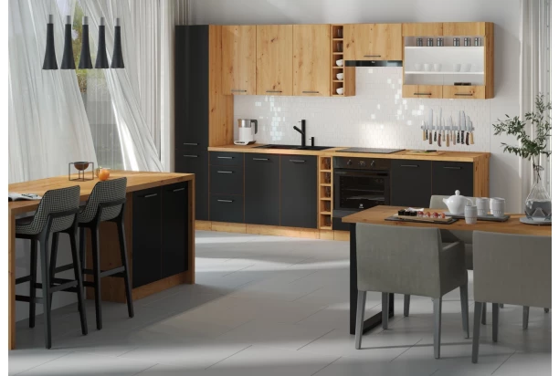 Dolní kuchyňská skříňka o šířce 80 cm z programu Modena – kuchyňský nábytek v dřevodekoru dub artisan/černá působí moderně a útulně zároveň. Jednotlivé elementy z kuchyňského programu Modena můžete mezi sebou různě kombinovat a sestavit si tak kuchyni podle vašich představ a prostorových možností.