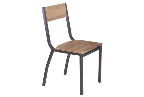 Jednoduchá jídelní židle má stabilní konstrukci z kovu v tmavě hnědém provedení. Sedací a opěrná část v dekoru dub artisan se dobře hodí k nábytku v prostoru jídelny.