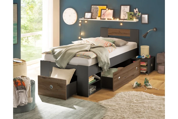Maximálně praktická postel s nočním stolkem, úložnými zásuvkami a bočním regálem je ideální nejen do malého prostoru. Plocha lůžka 90×200 cm, vyrobena v kombinaci dekoru dub flagstaff/grafit.
