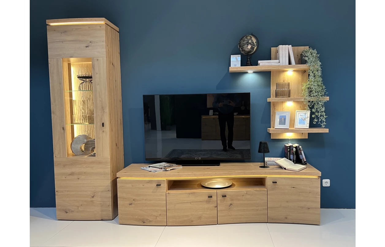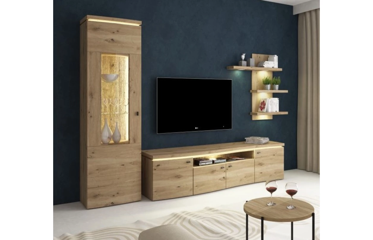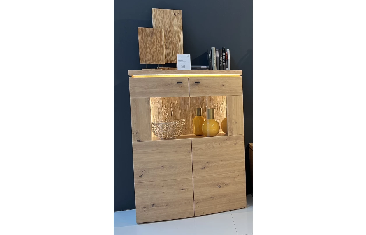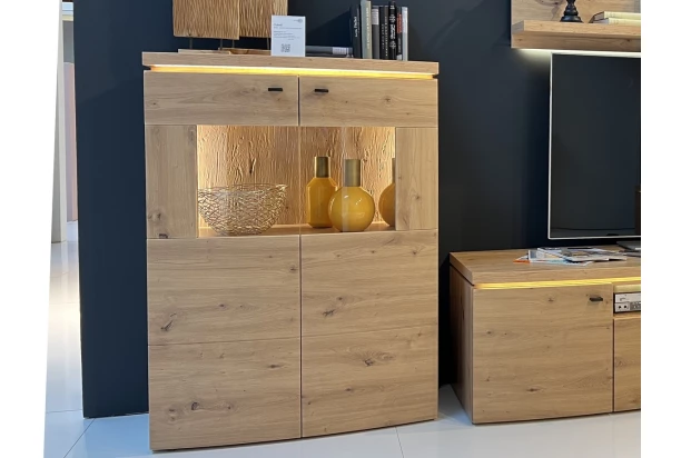 Prosklená skříňka z kolekce Bolus – originálně zaoblené přední plochy nábytku spolu s dřevodekorem dub artisan působí v interieru velmi elegantně, harmonicky a zároveň útulně. Zesílený horní rám nábytku obsahuje zabudované osvětlení, díky kterému ještě více vyniknou oblé tvary a útulná atmosféra interieru během večera. Navíc oceníte i kvalitu zpracování, tento originálně řešený nábytek je vhodný i pro náročné.