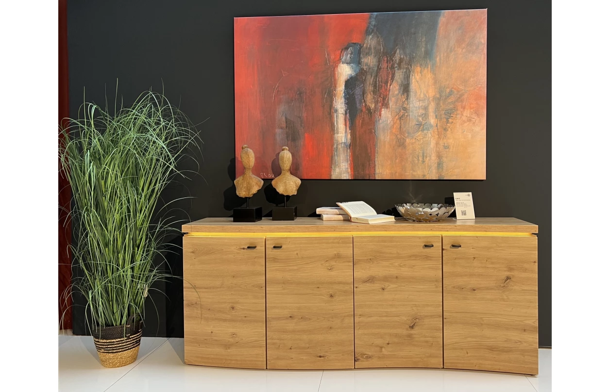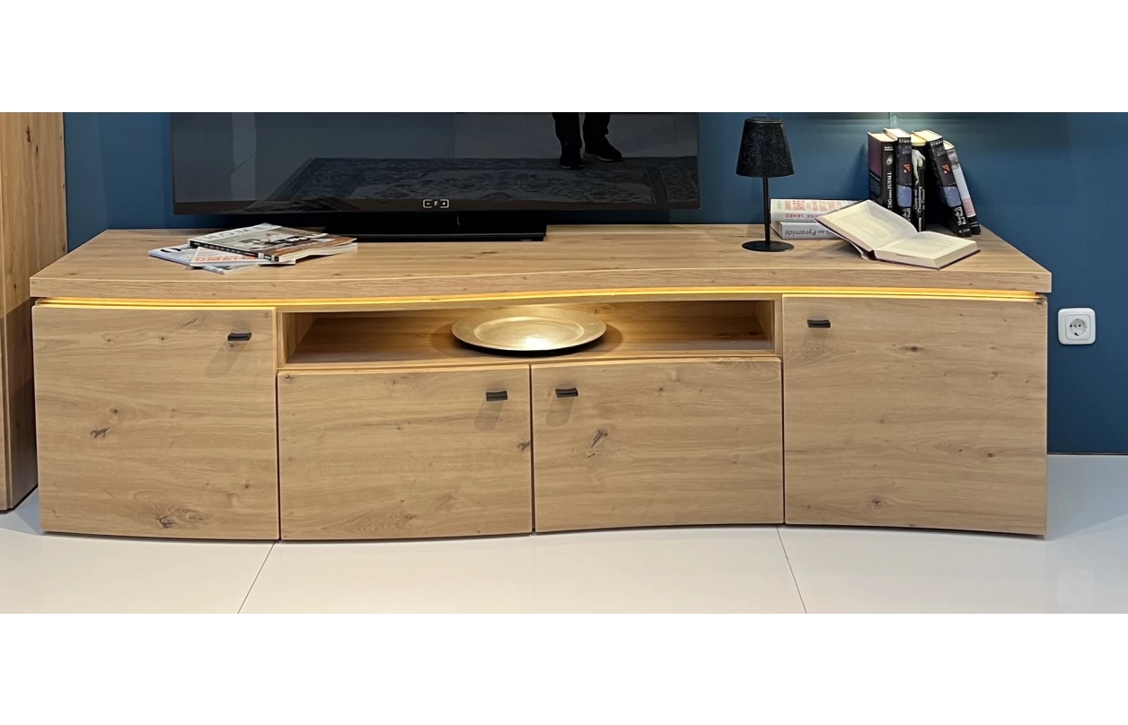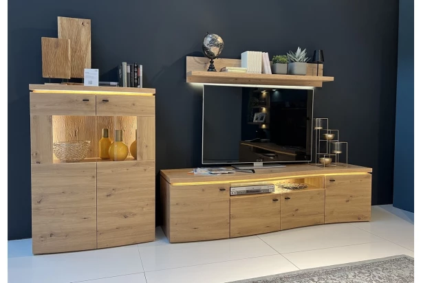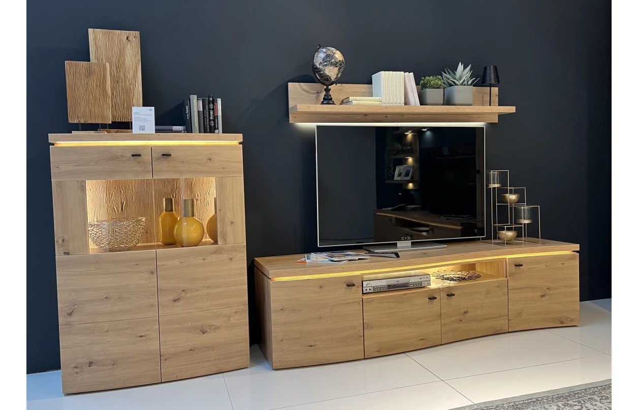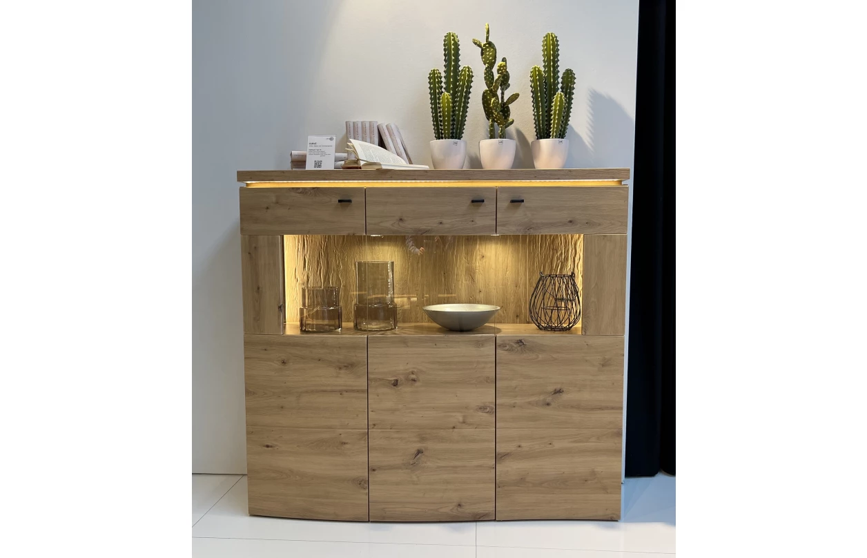 Prosklená skříňka z kolekce Bolus – originálně zaoblené přední plochy nábytku spolu s dřevodekorem dub artisan působí v interieru velmi elegantně, harmonicky a zároveň útulně. Zesílený horní rám nábytku obsahuje zabudované osvětlení, díky kterému ještě více vyniknou oblé tvary a útulná atmosféra interieru během večera. Navíc oceníte i kvalitu zpracování, tento originálně řešený nábytek je vhodný i pro náročné.