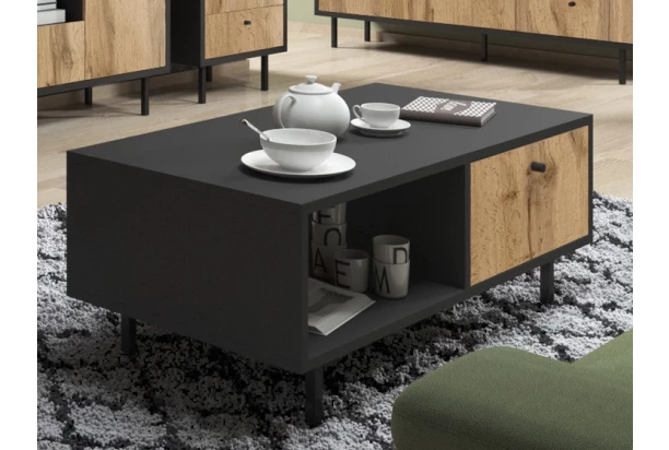 Konferenční stolek se zásuvkou z řady Bospe – čistě rovné linie nábytku zvýrazňuje kontrast černých ploch s dřevodekorem dub wotan, který působí útulně a domácky. Nábytek doplňují černé úchytky a kovové nožky, které působí vzdušně a zároveň umožňují praktické udržování podlahy v bytě. Univerzálním stylem se tento nábytek hodí pro zařízení téměř jakéhokoliv interieru.