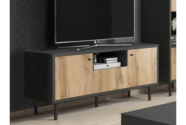 TV stolek z řady Bospe – čistě rovné linie nábytku zvýrazňuje kontrast černých ploch s dřevodekorem dub wotan, který působí útulně a domácky. Nábytek doplňují černé úchytky a kovové nožky, které působí vzdušně a zároveň umožňují praktické udržování podlahy v bytě. Univerzálním stylem se tento nábytek hodí pro zařízení téměř jakéhokoliv interieru.