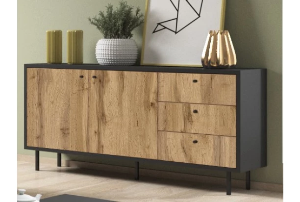 Široká komoda z řady Bospe – čistě rovné linie nábytku zvýrazňuje kontrast černých ploch s dřevodekorem dub wotan, který působí útulně a domácky. Nábytek doplňují černé úchytky a kovové nožky, které působí vzdušně a zároveň umožňují praktické udržování podlahy v bytě. Univerzálním stylem se tento nábytek hodí pro zařízení téměř jakéhokoliv interieru.