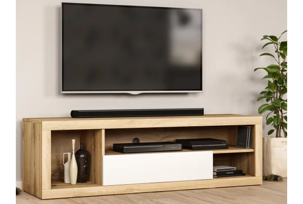 Jednoduše moderní TV stolek má optiku širokých bočních rámu a zajímavé uspořádání odkládacích přihrádek. Za středovými dvířky ukrývá úložný prostor na drobné předměty. Vyroben v kombinaci dub wotan/bílá.