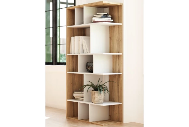 Moderní regál má originálně řešenou konstrukci v kombinaci dub wotan/bílá a může být umístěn ke stěně anebo do prostoru a tvořit tak zajímavý předěl v místnosti. Zesílený vnější rám doplňují různě velké přihrádky pro přehledné odkládání. Umístěním více regálů vedle sebe vznikne zajímavá a zároveň velmi praktická kompozice.