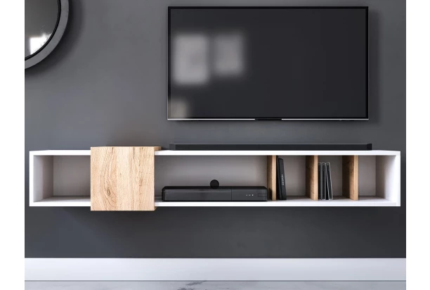 Nástěnný TV stolek v moderním stylu má celkovou šířku 150 cm a různě velké odkládací přihrádky pro uložení elektroniky, drobností nebo i dekorací. Jednoduchá, funkční a zároveň zajímavě řešená konstrukce je vyrobena v kombinaci bílá/dub zlatý. Zavěšené řešení TV stolku působí v místnosti vzdušně a zároveň umožňuje snadné udržování podlahy.