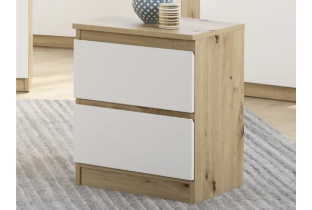 Skříňka/noční stolek se 2 zásuvkami v dekoru dub artisan/bílá nabízí praktické úložné prostory, účelnost a čisté linie tvarů, které se hodí do každého interieru.