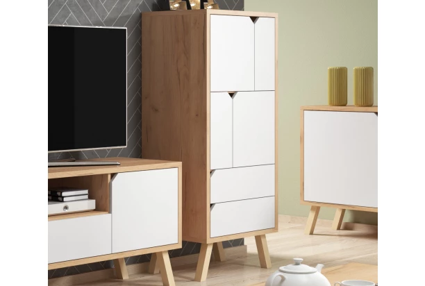 Vysoká skříňka se zásuvkami z nábytkové řady Tokio – nábytek ve skandinávském stylu má své kouzlo a je velmi oblíbený. Masivní dřevěné nožky a útulný dřevodekor dub zlatý vytváří příjemný kontrast k bílým předním plochám. Nožky ze dřeva dodávají nábytku stabilitu a zároveň působí zajímavě.