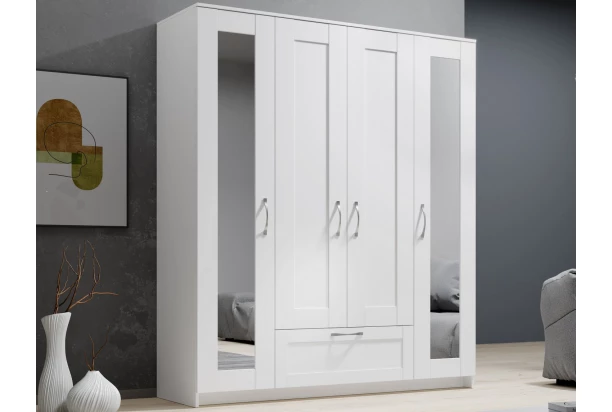 Bílá šatní skříň o šířce 156 cm v klasickém stylu má rámované přední plochy, zrcadla a zaoblené úchytky. Za 4 otočnými dveřmi najdete praktické poličky i závěsnou šatní tyč. Do prostorné zásuvky můžete uložit například drobné prádlo nebo doplňky.