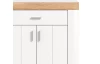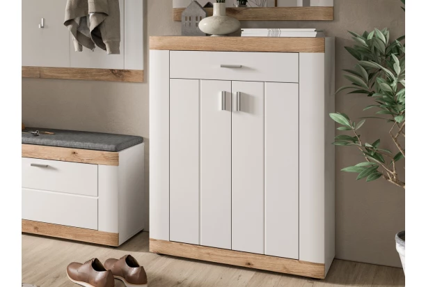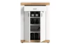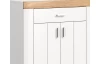 Skříňka s policemi/botník z kolekce Laredo – elegantní bílý nábytek v kombinaci s dubovým dřevodekorem má okrasně rylované linie a široké přední rámy se zaoblením. Tento stylový nábytek působí na pohled masivním dojmem a dobře doplní interiery v klasickém anebo rustikálně laděném stylu, kde vytvoří příjemnou domáckou atmosféru.