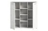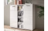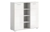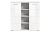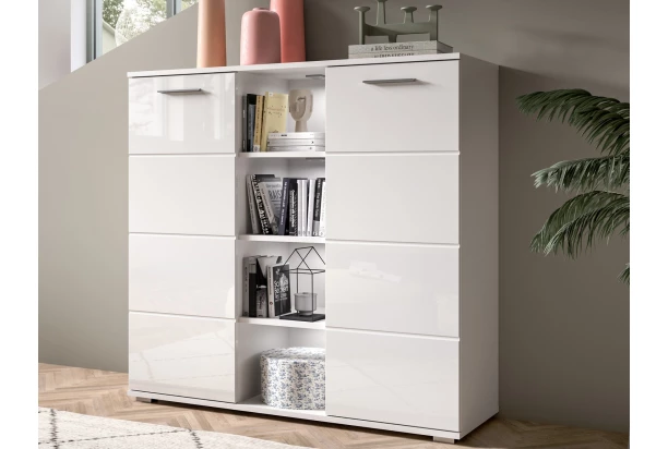 Vysoká skříňka s přihrádkami z programu Prego – moderní, praktický a zároveň nadčasový nábytek s leskle bílými předními plochami, které se hodí téměř do každého moderního interieru. Přední plochy doplňují elegantní horizontálně frézované linie. Skříňka o šířce 110 cm má 4 otevřené odkládací přihrádky a 2 otočné dveře, za kterými najdete výškově nastavitelné police pro všestranné ukládání nejrůznějších věcí. Do otevřených přihrádek lze umístit dekorace, fotky, knížky, prádlo nebo třeba dokumenty. Skříňku tak využijete nejen v obýváku, jídelně nebo ložnici, ale i v prostoru předsíně, chodby, šatny anebo domácí pracovny. Snadno udržovatelné povrchy lze čistit lehce navlhčeným hadříkem pro odstranění prachu a nečistot. Tato bílá úložná komoda bude díky svému univerzálními stylu pasovat do mnoha domácností, kde prakticky poslouží.