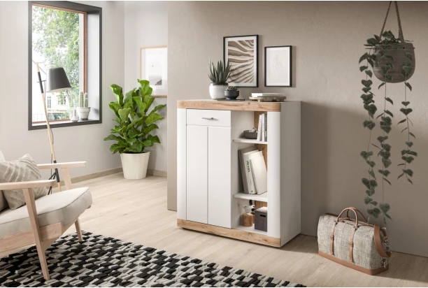 Skříňka s přihrádkami z kolekce Laredo – elegantní bílý nábytek v kombinaci s dubovým dřevodekorem má okrasně rylované linie a široké přední rámy se zaoblením. Tento stylový nábytek působí na pohled masivním dojmem a dobře doplní interiery v klasickém anebo rustikálně laděném stylu, kde vytvoří příjemnou domáckou atmosféru.