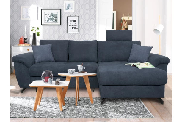 Rohová sedací souprava na černých kovových nožkách má elegantně zaoblené tvary a příjemný komfort sezení. Sedačka je očalouněna látkou v barvě námořnická modrá a doplněna malými polštářky. Díky svým rozměrům pasuje i do menšího prostoru, otoman můžete univerzálně umístit na pravou nebo levou stranu a přizpůsobit si tak roh sedačky podle potřeby. Oceníte i rozkládací funkci, úložný prostor nebo také podhlavník, který lze umístit za libovolný polštář.
