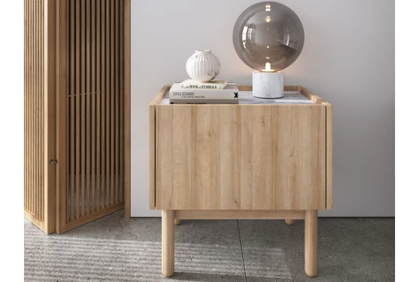 Noční stolek z kolekce Boho – útulný a na pohled velmi zajímavý nábytek v dřevodekoru dub riviera zvýrazňuje dřevěná podnož a horní plochy v imitaci bílého mramoru. Doplňte si tak interier netradičním nábytkem, který si oblíbíte.