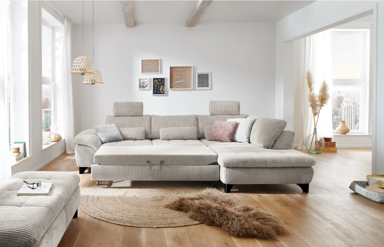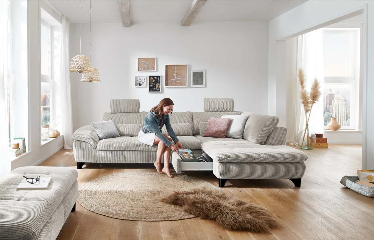 Rohová sedací souprava v trendovém stylu je pro všechny, kdo milují příjemně měkké pohodlí. Oceníte kvalitní zpracování, prostorné sezení i opěradla v polštářové optice. Rohová sedačka s otomanem vytváří levý roh a je očalouněna měkkoučkou strukturovanou látkou v barvě krémová. Rohová varianta sedačky navíc nabízí funkci nastavení hloubky sedu, výškově nastavitelné opěrky hlavy, polohování boční područky, rozkládací funkci na příležitostné lůžko a praktickou úložnou zásuvku.