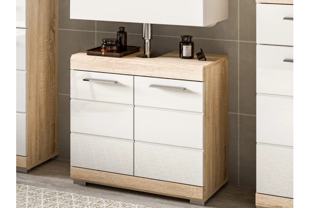Koupelnová skříňka pod umyvadlo z řady Lambada – moderní, nadčasový a zároveň praktický nábytek do koupelny v kombinaci dub sonoma s leskle bílými přední plochami. Přední plochy se zkosenou hranou a decentně frézovanými liniemi jsou příjemným detailem. Za otočnými dvířky najdete úložný prostor a výškově nastavitelnou polici.