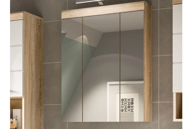 Koupelnová skříňka se zrcadlem z řady Lambada – moderní, nadčasový a zároveň praktický nábytek do koupelny v kombinaci dub sonoma se 3 zrcadlovými dvířky. Přední plochy se zkosenou hranou jsou příjemným detailem. Za 3 otočnými dveřmi najdete úložné prostory s poličkami pro uschování kosmetických potřeb. Horní hranu skříňky lze navíc individuelně doplnit doplňkovým osvětlením.