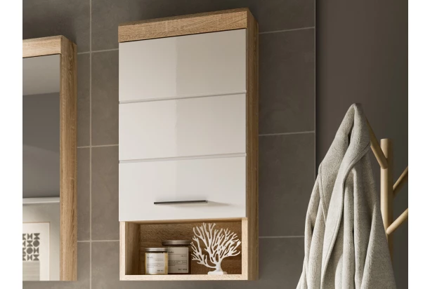 Nástěnná koupelnová skříňka z řady Lambada – moderní, nadčasový a zároveň praktický nábytek do koupelny v kombinaci dub sonoma s leskle bílými přední plochami. Přední plochy se zkosenou hranou a decentně frézovanými liniemi jsou příjemným detailem. Za otočnými dvířky najdete úložný prostor a výškově nastavitelnou polici.