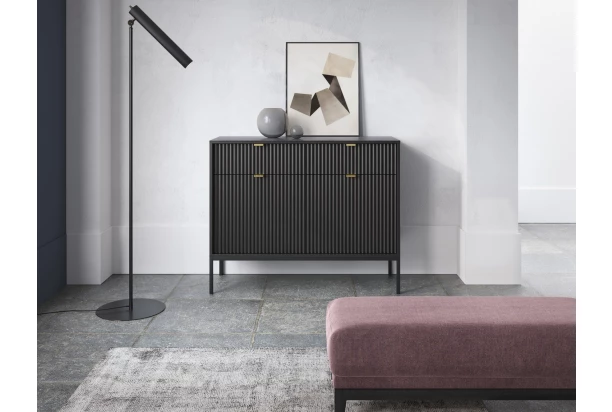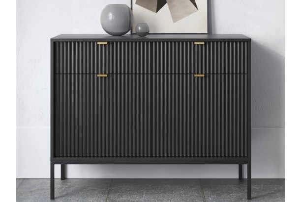 Komoda se zásuvkami z kolekce Nova – atraktivní nábytek s černými strukturovanými povrchy zaujme v každém moderně zařízeném interieru. Stylový design podtrhují úchytky ve zlatém provedení a černá kovová podnož, díky které působí nábytek lehce a zároveň umožňuje snazší údržbu podlahy.